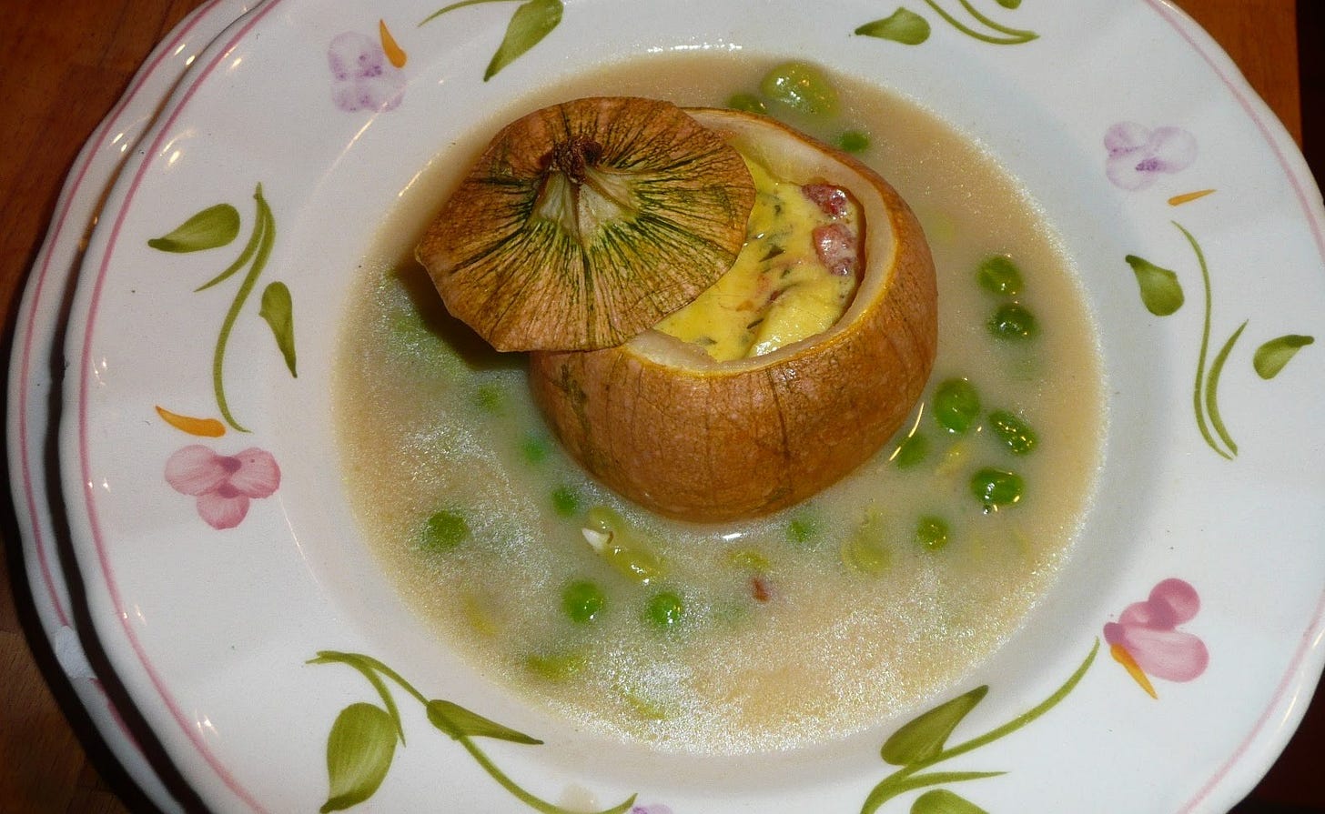 In this season when little squash are the most vibrant vegetables in stores and markets, I turned some into edible trenchers. But because I served them in a post-Christmas turkey bones broth, they couldn’t be plated up on a leaf and did need cutlery. The squash contained a vegetable timbale, a savoury egg custard. You can use any vegetables languishing in your fridge, diced. I’ve not specified how to make a broth. I’m sure you already know. Nor have I much detailed more than the principle of the timbale, for the same reason. But basically, it’s quiche-filling liquid.