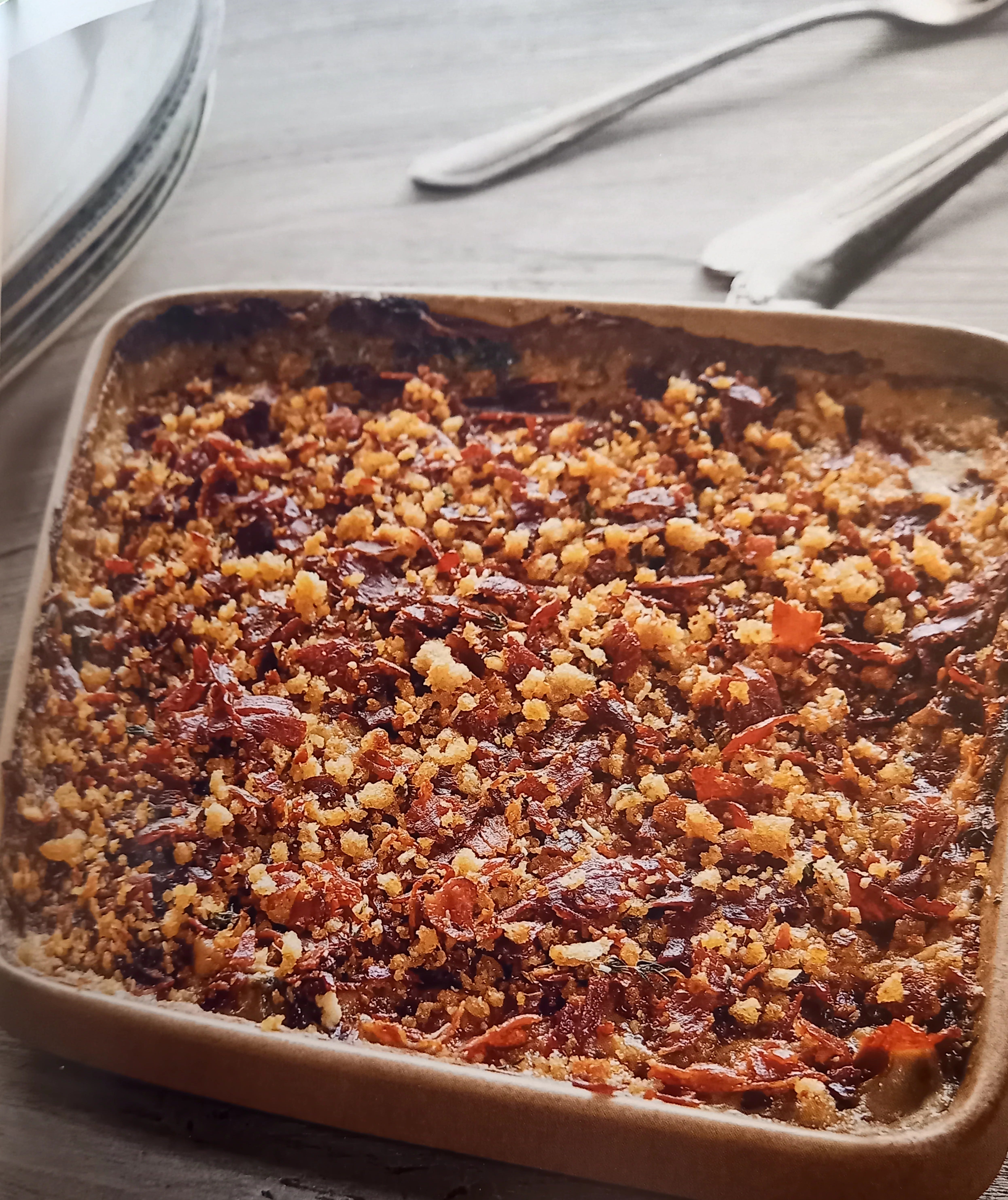 This dish was jumped on by the photographer’s two vegetarian assistants when I was cooking the recipes for Bruno’s Cookbook. All you need to do to make it vegetarian is leave out the ham in the crumb topping, as I had with one for them. If you don't fancy it as a different Thanksgiving side dish, it's a useful one to have in the freezer as something to bung in the oven any time of year when you’ve guests and their tickle of hunger emerges but you're too tired to move. Toss over it chunks of goats cheese or feta and you have a filling main course.