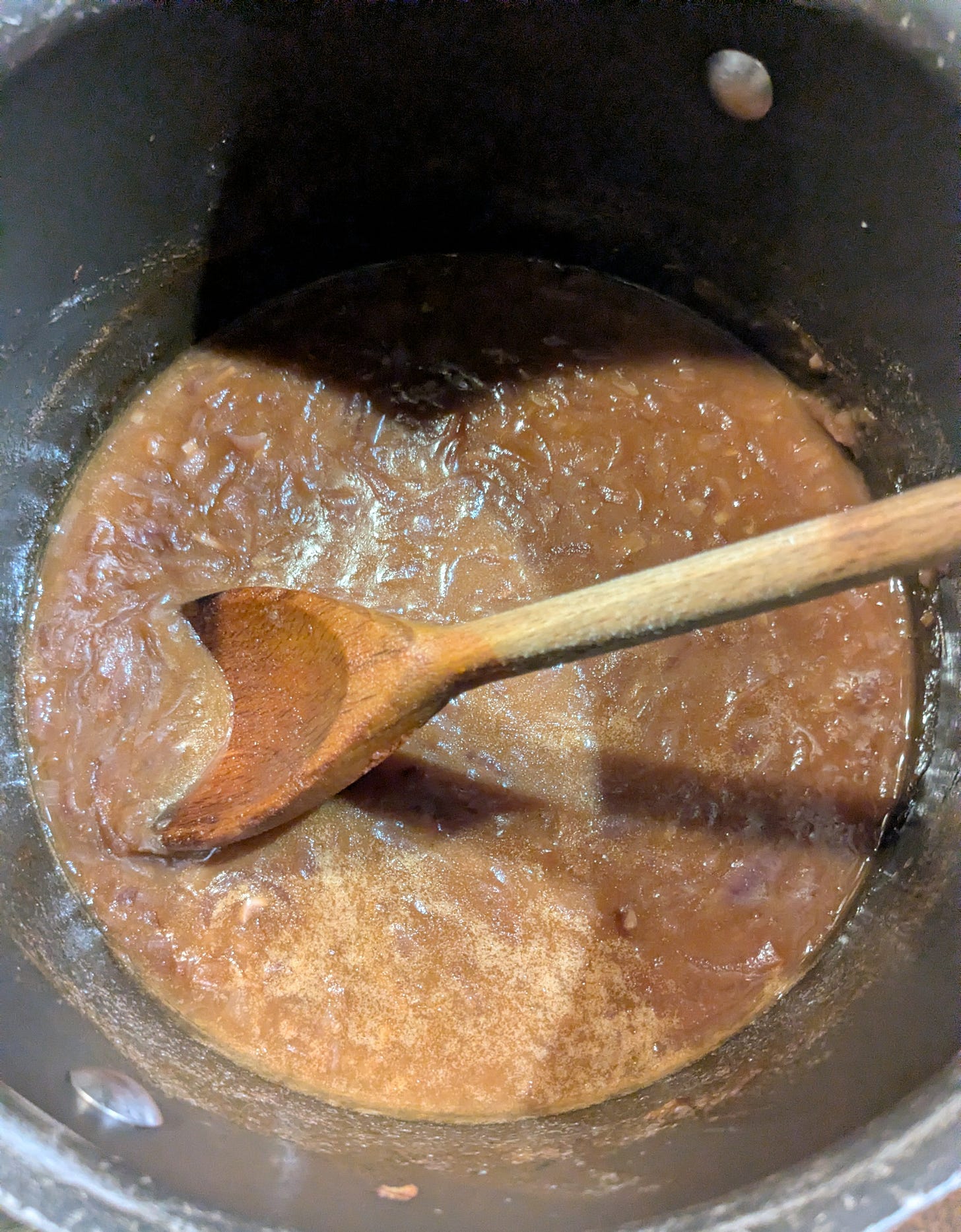 Remove the cover, stir in the salt and sugar, and cook gently until the onions have turned deep brown, stirring regularly. If they begin to catch, stir in a tablespoon of water and scrape up. Sprinkle over then stir in the flour. Cook out the flour, stirring once or twice for 2-3 minutes. (Yes, a lot of stirring in this recipe.)