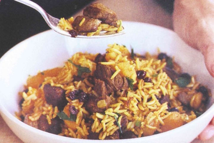 The early Arab Abbasid dynasty, centred in Persia (Iran), was keen on meats cooked with fruits, especially the mishmish, the apricot, which emphasises the mild sweetness of lamb. This is as close as I can come to that ‘wedding’ feast’s Lamb Plov - or Polo as it would be in Persian cuisine.