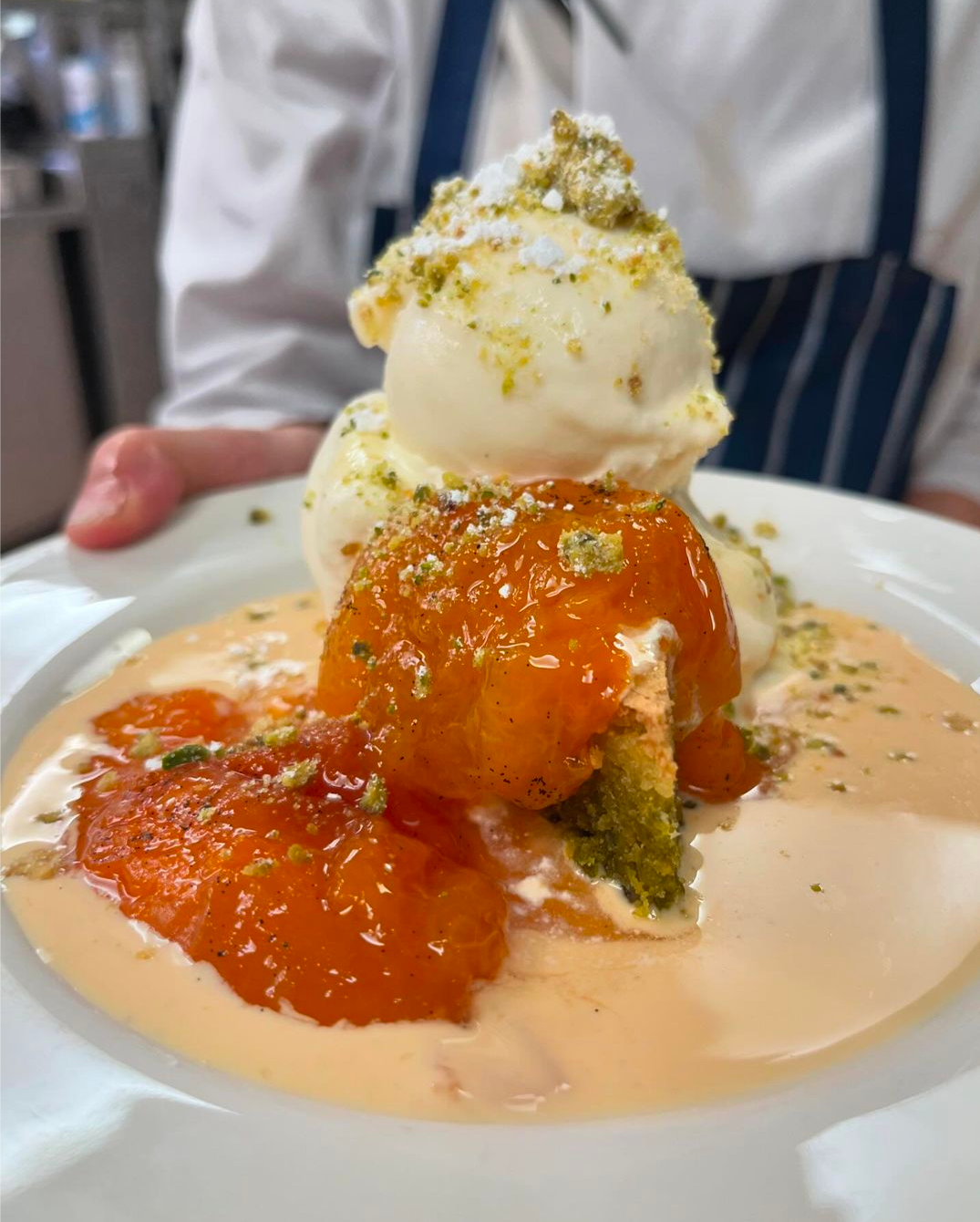 It’s a pistachio cake, green, in a puddle of scented cream and cloaked in a fudge-like, chunky apricot puree, under a ball of ice cream. Along with the extra crunch of crushed pistachios, there was quite possibly more cream involved.